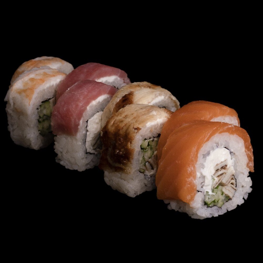 Лосось, креветка тигровая, тунец, сыр креметта, томаго омлет, огурец, рис, нори
