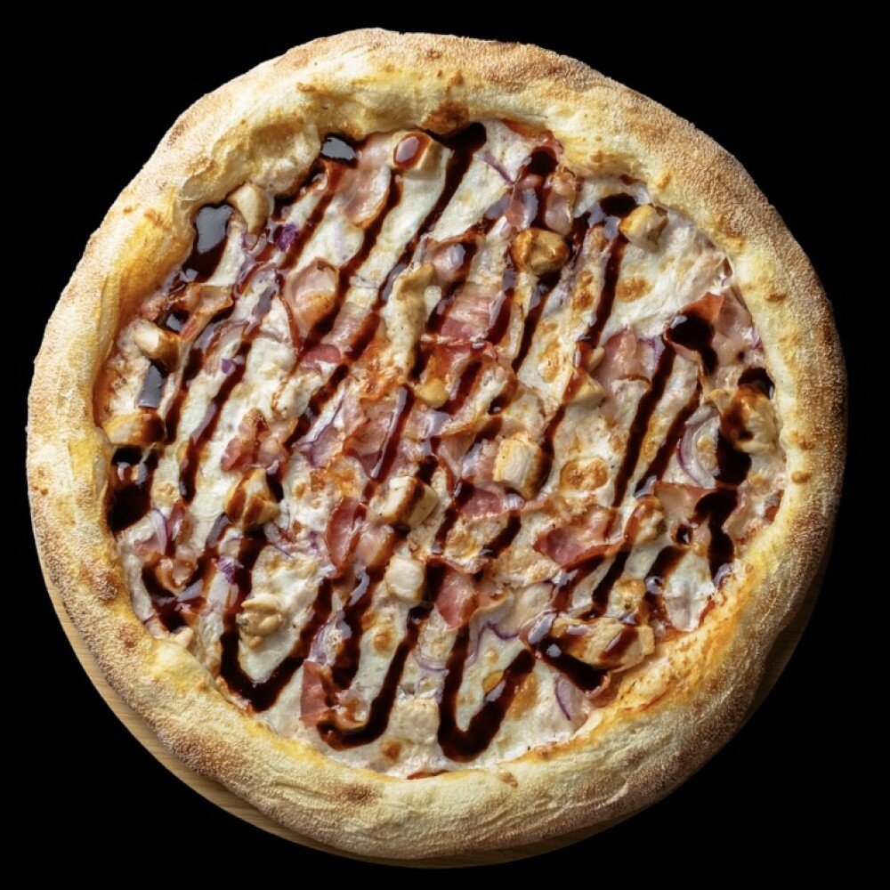 Красный соус, моцарелла, куриное филе, бекон, ялтинский лук, соус барбекю.