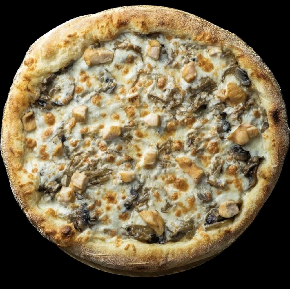 Белый соус, моцарелла, курица, грибы.