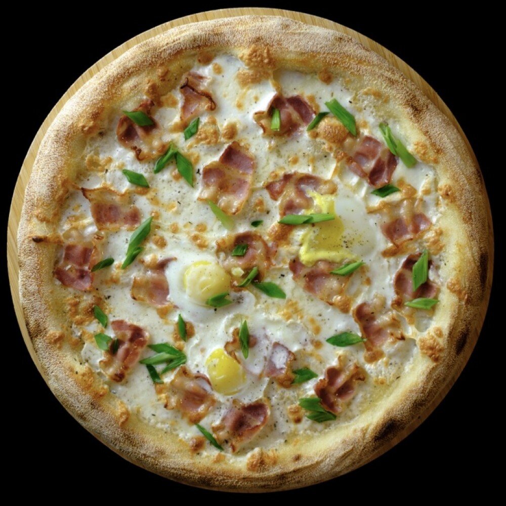 Белый соус, моцарелла, бекон, перепелиные яйца, зелень.
