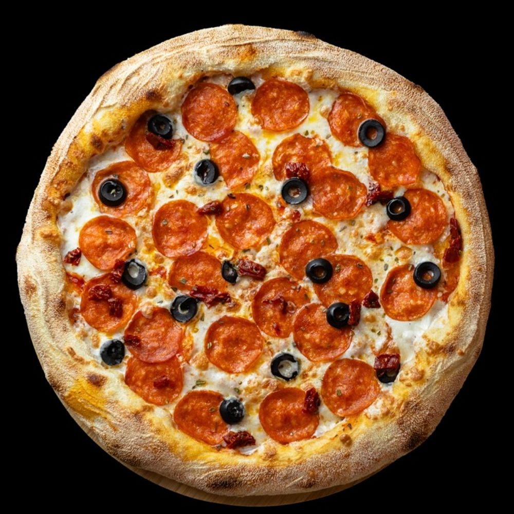 Пепперони, моцарелла, маслины, лук ялтинский, вяленые томаты, красный соус.