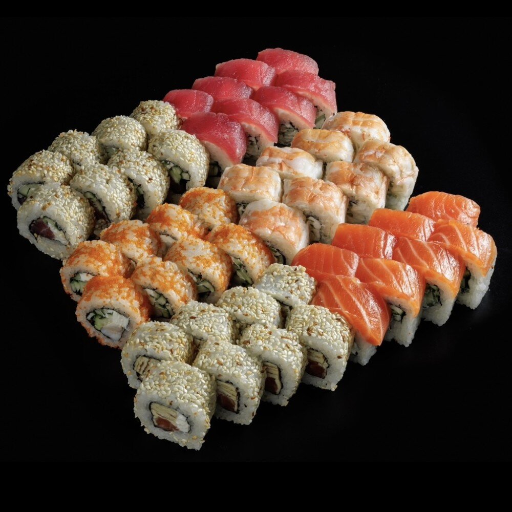 Мини Филадельфия: тунец, лосось, креветка. Мини Аляска: лосось, тунец. Мини Калифорния: креветка. Вес: 1000 г. Не суммируется с другими акциями и скидками