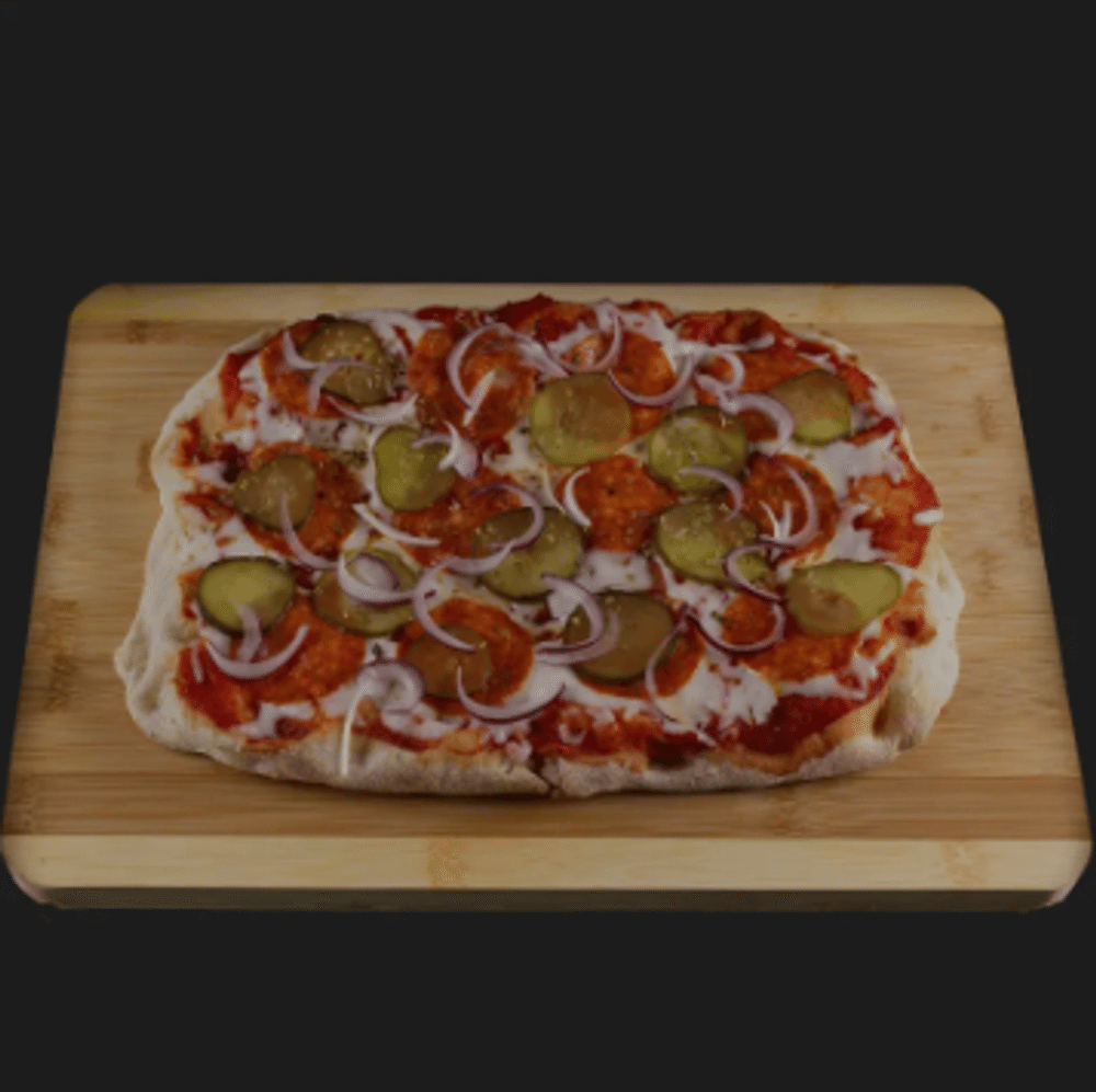 Пепперони, моцарелла, соленые огурцы, ялтинский лук, красный соус.