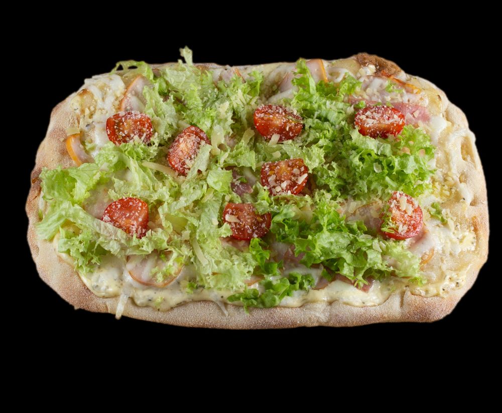 Варено-копченая курица, бекон, черри, моцарелла, айсберг, белый соус.