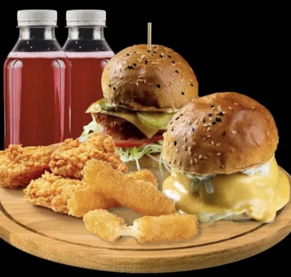 Чизбургер, cырный бургер, сырные палочки, наггетсы, морс 2 х 0,3 л.